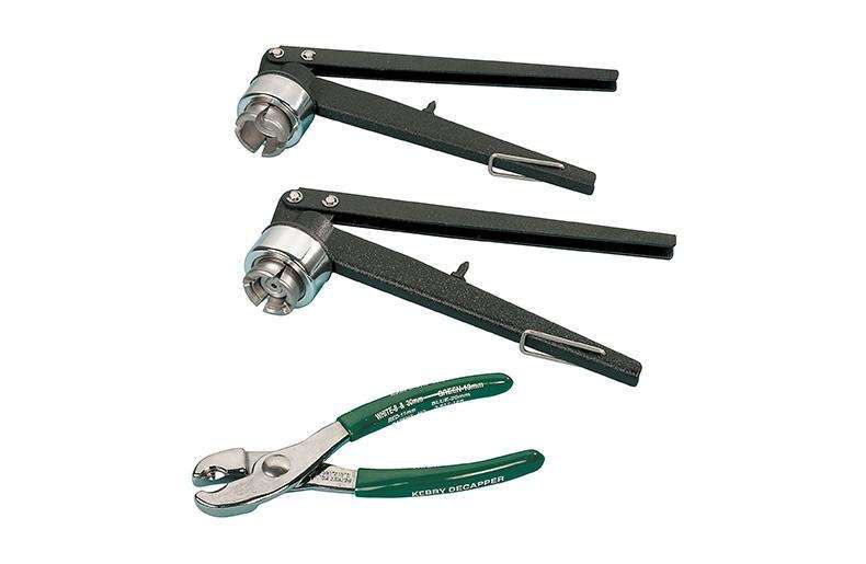 Hand Crimping Tongs: These vial crimping tongs are fitted with hardened steel jaws for long life and reproducibility of seal crimp quality. There is an adjustable stop to ensure that equal pressure is supplied to each crimp. Hand Decapping Pliers: These vial decapping pliers are designed to remove seals from vials with a press and wrench action. The handles are plastic coated. Hand Decapping Tongs: These vial decapping tongs have hardened steel jaws for the easy removal of crimp top seals, by squeezing the handles together.