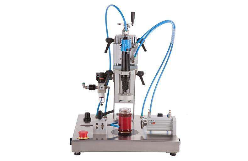 A benchtop, hand operated, spring loaded machine designed to enable the easy fixing of press-on lids and caps to glass or plastic bottles. It has adjustable height and depth to accommodate a wide range of container heights and cap diameters.